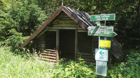 Jetzt ist Nachmittag und wäre Zeit für ein Eis. Wir suchen im Stadtzentrum, finden aber nichts. Etwas traurig gehts nun weiter nach Bad Schlema, wo der Campingplatz unser Etappenziel ist. Der Mulde-Radweg wird über die Auer Thalstraße geführt. Wir folgen der Straßenbeschilderung nach Bad Schlema und biegen an einem Supermarkt links in die Lößnitzer Straße ab, müssen gleich noch einmal eine Steigung meistern und kreuzen unten dim Tal die Hauptstraße, finden aber keine Gastronomie, weil wir geschickt am Zentrum des Kurorts vorbei geführt werden und keine Lust auf wieder bergan strampeln haben. Nördlich des Kurparks gibt es am Bach Schlema einen Weg. Erst am Besucherbergwerk ist ein Stück weiter an der Straße ein Biergartenhinweisschild zu erkennen. Im Biergarten vom Huthaus gibt es dann die langersehnte Abkühlung. Es gefällt uns gut und wir wollen einen Platz für den Abend vorbestellen. Doch es sei bereits alles reserviert, gäbe nur Plätze innen, die man jedoch für die reserverten Außenbesucher freihalten will, falls es regnen wird. Also keine Chance.